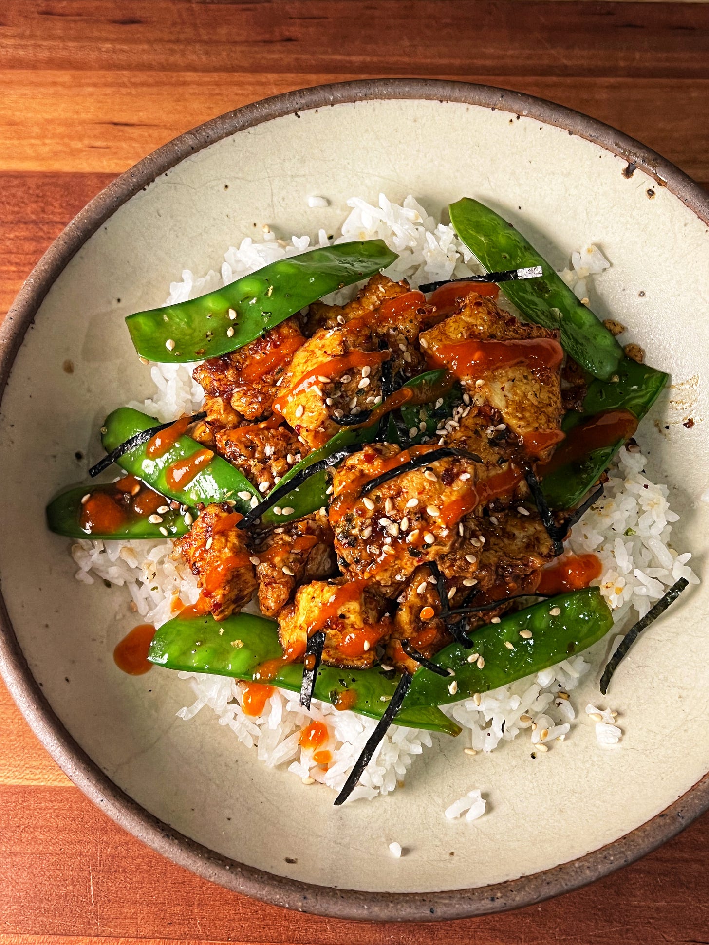 Serve the tofu with rice and snow peas. Optionally, sprinkle with sesame seeds and drizzle with sriracha.